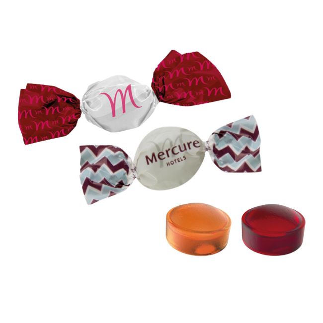 Egyesével csomagolt töltetlen kemény cukorka egyediesíthető csomagolásban, választható gyümölcsös ízben.